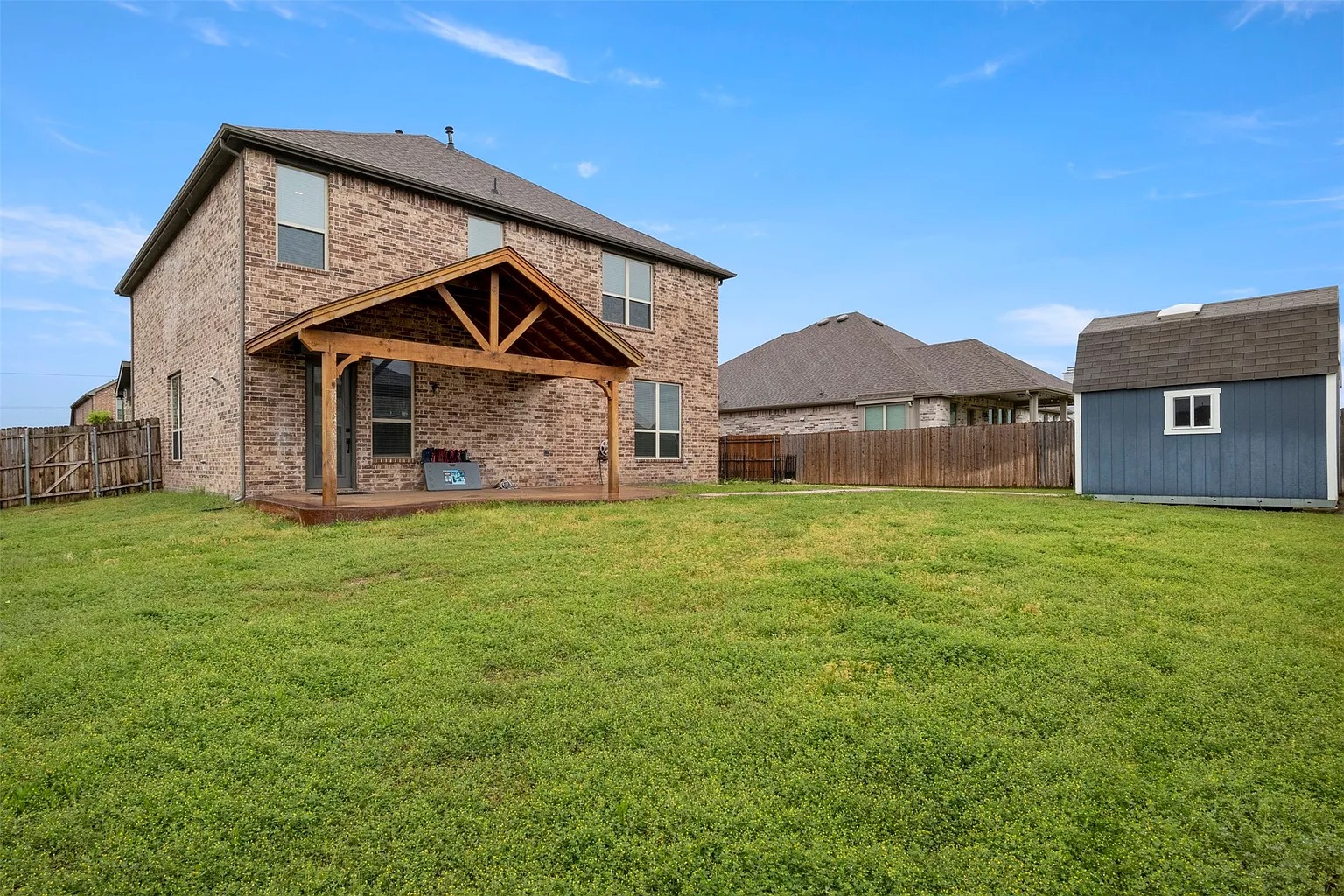 - 확장된 콘크리트 파티오, 퍼골라, 창고가 있는 넓은 뒷마당